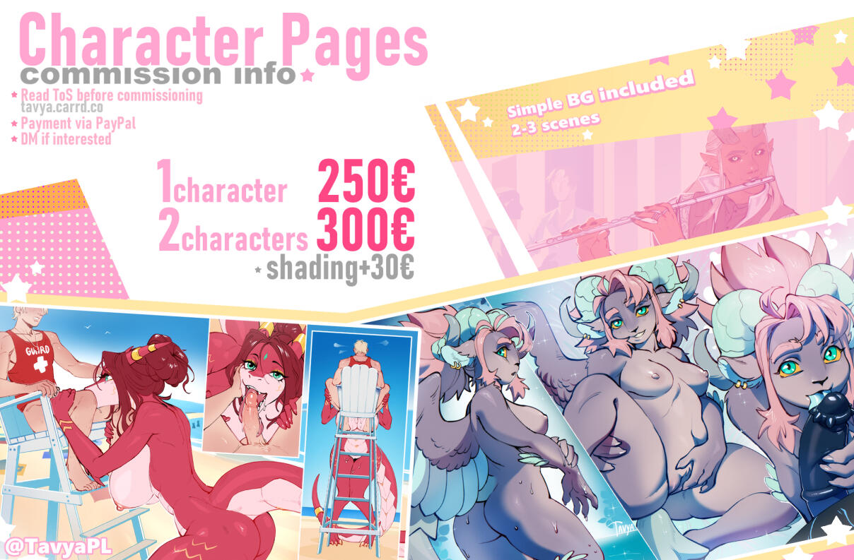 A simple sketch of your character, usually on a white background. The cleanliness of the sketch depends on the brush I choose for the commission. Simple shading can be added (basic cell shading, sometimes with highlights). Backgrounds or additional elements besides the character are available for an extra fee, depending on complexity. Comics are also done at this price.+ Additional Character +100% of the price
